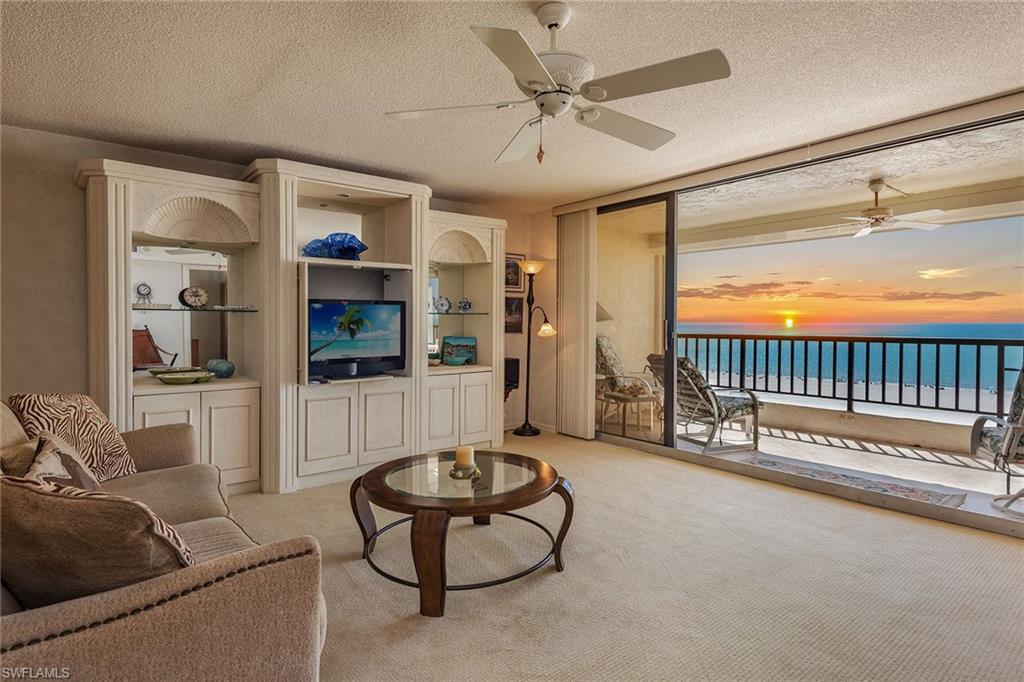 Commanding a premier beachfront position, this exceptional Gulf-front residence captures sweeping, unobstructed views and the kind of sunsets that define the Marco Island lifestyle. Rarely available and sought after, this front-facing condominium offers just under 1,500 square feet of refined coastal living, with two bedrooms and two baths designed for comfort and sophistication. From moment you enter, the focus is clear, endless water views. A beautifully appointed chef's kitchen is positioned to overlook the Gulf, elevating everyday living and entertaining alike. Whether gathering at the breakfast bar or hosting in the dining area, every space is designed to maximize light, views and connection to the outdoors. The primary suite serves as a private sanctuary, opening directly to an expansive lanai where rhythm of the waves and the glow of evening sunsets create an unparalleled setting. The spa-inspired bath features a soaking tub, separate walk-in shower and generous proportions that enhance the sense of retreat. Residents enjoy a curated collection of resort-style amenities, including a striking beachfront pool near the sand, a fully equipped fitness center, and pickleball and tennis courts. A well-appointed community room offers an elegant space for gatherings and entertaining. Along six miles of pristine, sugar white beach, this is more than a residence, it is a rare opportunity to own a front-row seat to one of Southwest Florida's desirable coastal settings, where luxury living meets effortless elegance.