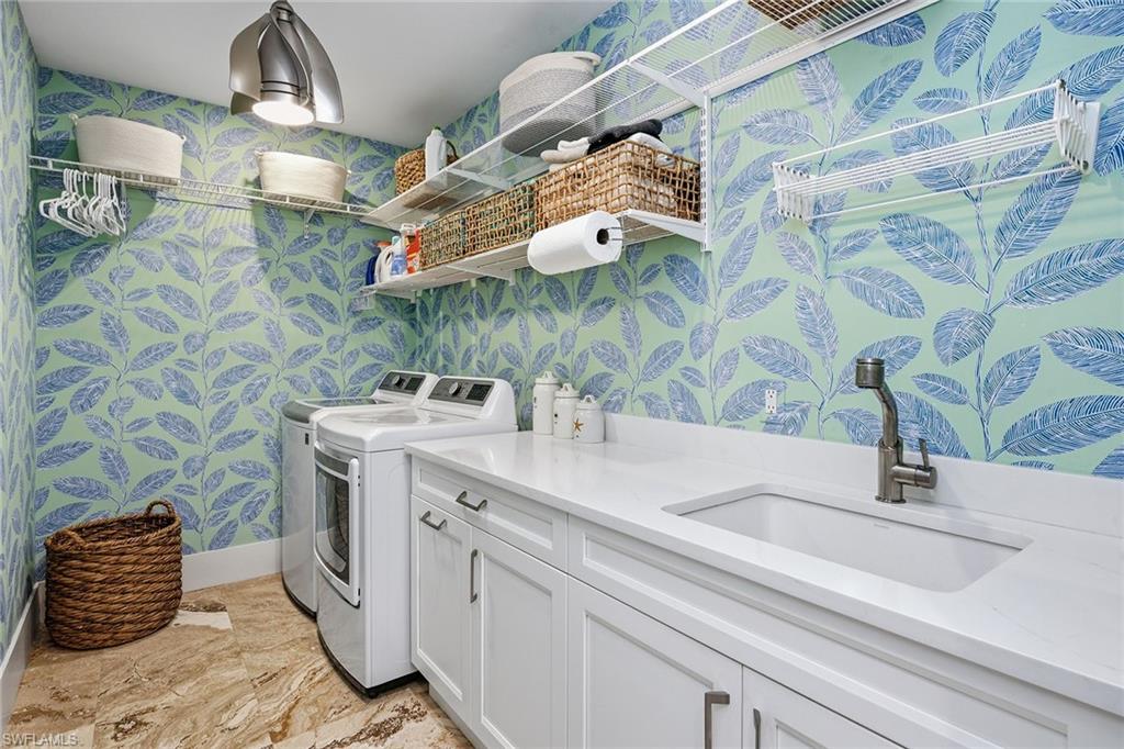 The chef-inspired kitchen is an entertainer's dream, featuring quartz countertops, an oversized eat-in dining area with seating for ten, a large wine cooler, and a spacious coffee bar--all overlooking the serene morning vistas of Collier Bay.